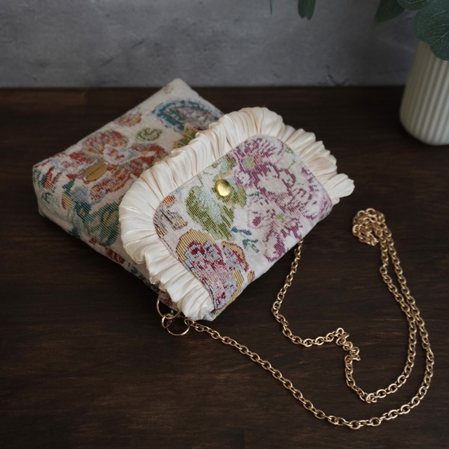 身軽さと上品さを両立。大人のためのスマホポシェット。 「荷物は最低限で身軽に出かけたい。でも上品さは譲れない」そんな願いを叶えるスマホショルダーです。アイボリーベースに華やかな色合いの花々を織り込んだ生地に、フラップ周りに繊細なプリーツフリルをあしらった個性的な一品です。 生地は立体感のあるジャガード織りで、高級感のある手触りです。明るいトーンのため、華やかな印象を与えてくれます。 バッグの中身は、スマホ、カードケース、ミニ財布、ハンドクリームなど、必要最低限のアイテムが過不足なく収まる設計です。フラップはマグネット式で、片手でスムーズに開閉でき、動作がスムーズで便利です。 普段のお出かけや、お散歩、旅行時のサブバッグまた、パーティーなどのオケージョンシーンにも最適です。シンプルな装いでも、このバッグを持つだけで華やかなアクセントになります。 【仕様詳細】 ・サイズ:タテ 18cm × ヨコ 15cm × マチ4cm ・チェーン:長さ 約100cm (取り外し可) ・開閉:マグネットボタン式 【注意事項】 ※発送時にたたみシワがつくことがあります。 気になる方はアイロンの一番弱い温度でサッとかけてください。 アイロン時、長い時間当て続けますと生地が痛むのでお控えください。 ※繊細な生地を使用しているためお取り扱いにはご注意ください。 ※お洗濯はお控えください。