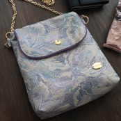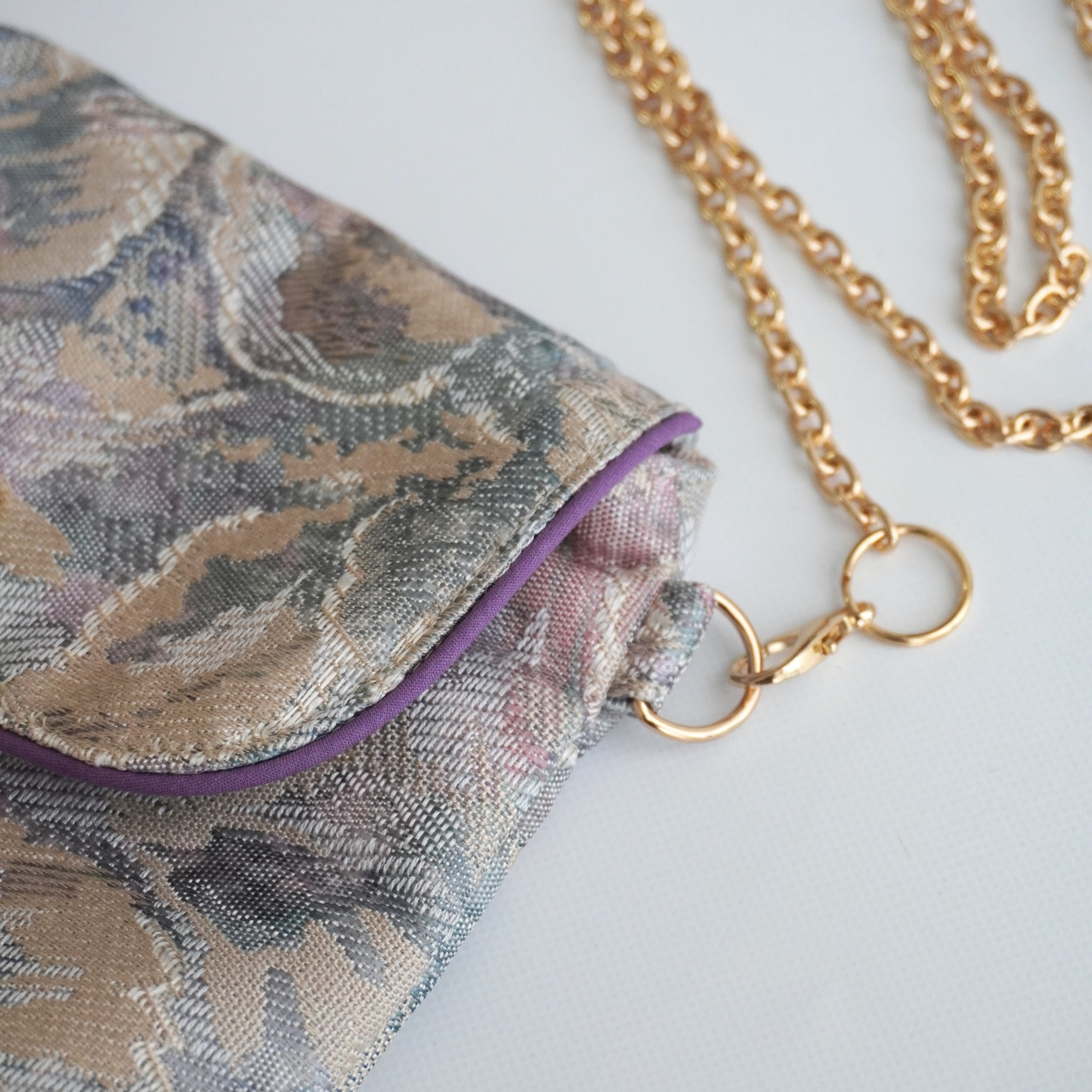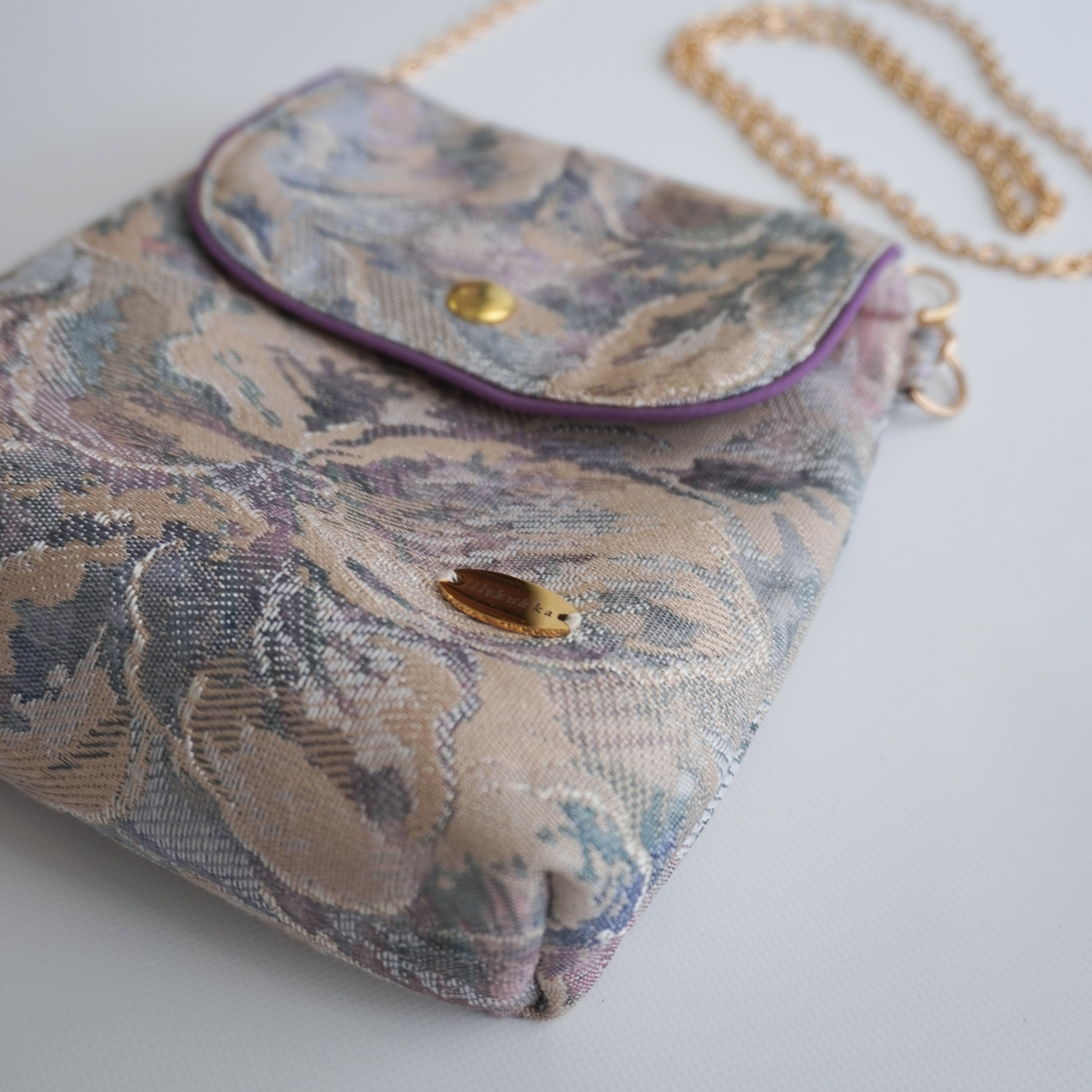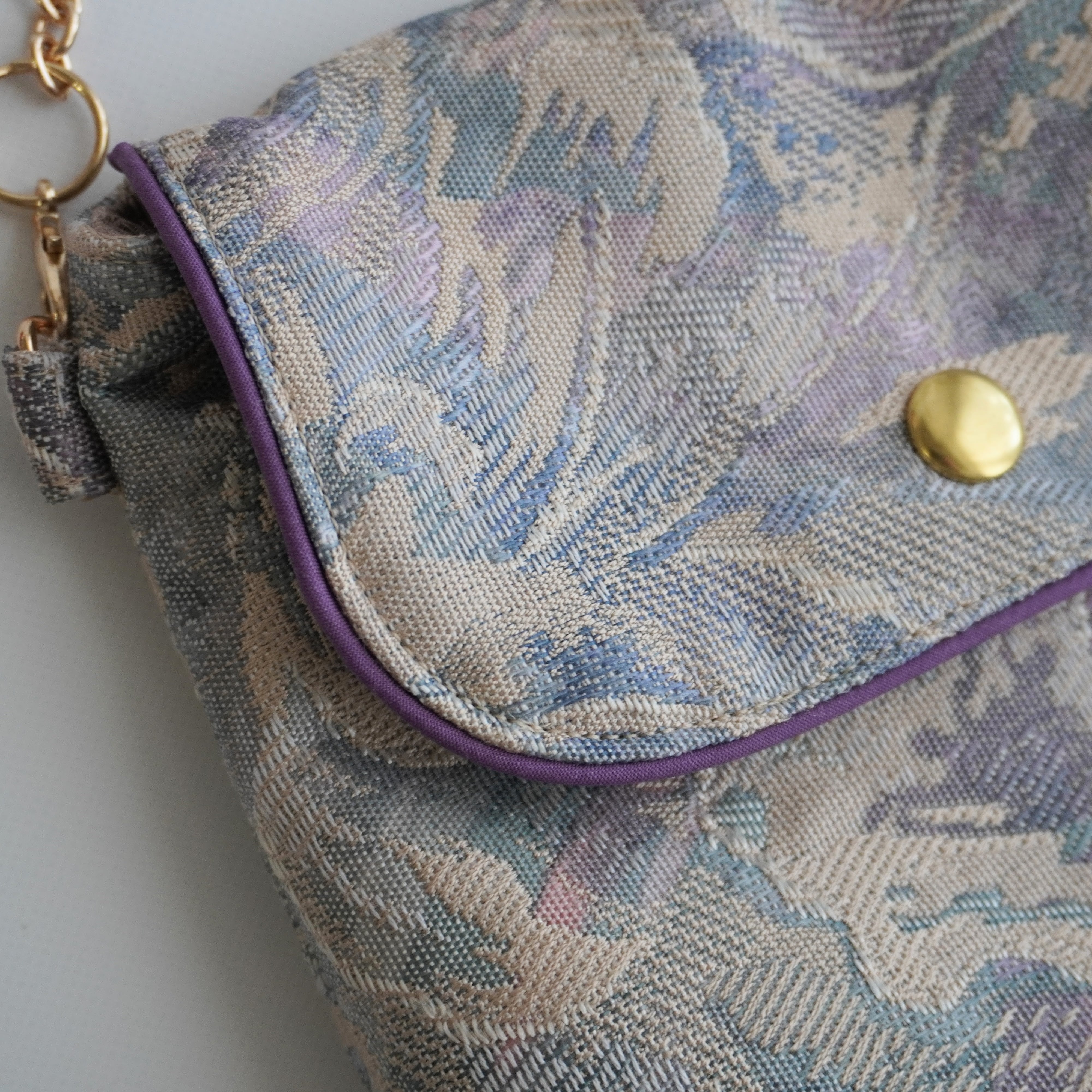 生地は立体感のあるジャガード織りで、高級感のある手触りです。また、フラップ部分にはパープルのパイピングを施し、アクセントとしました。
