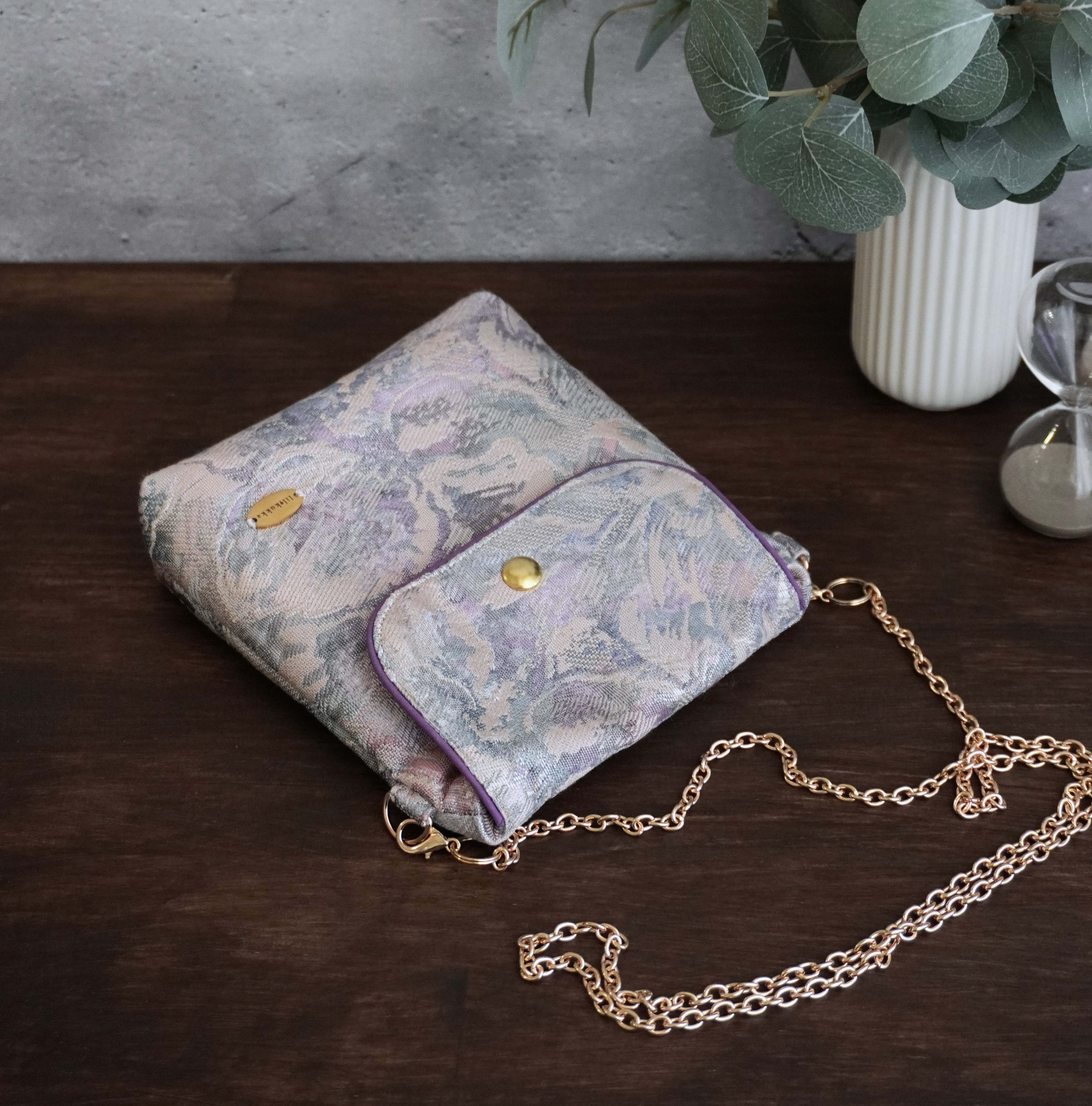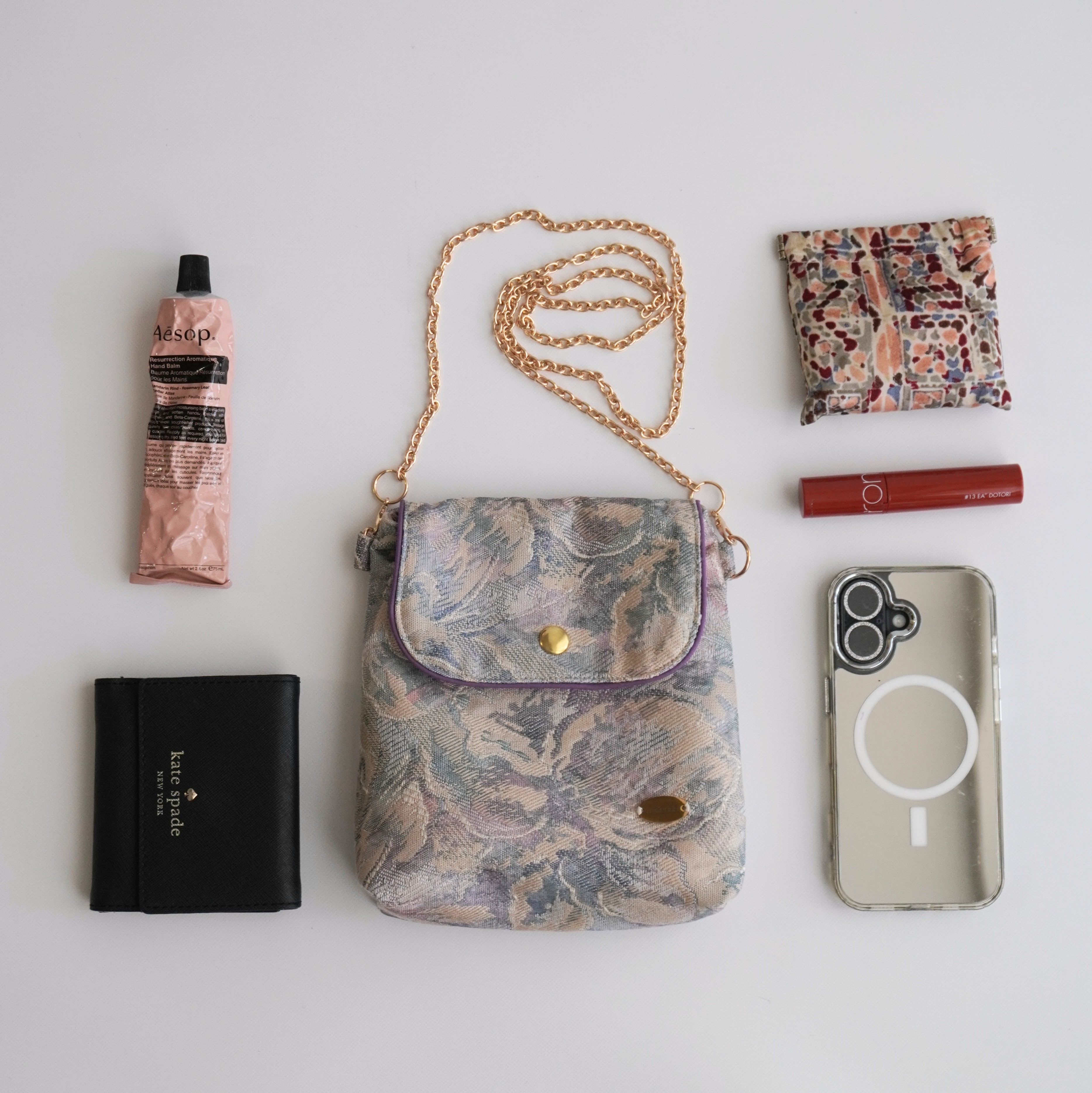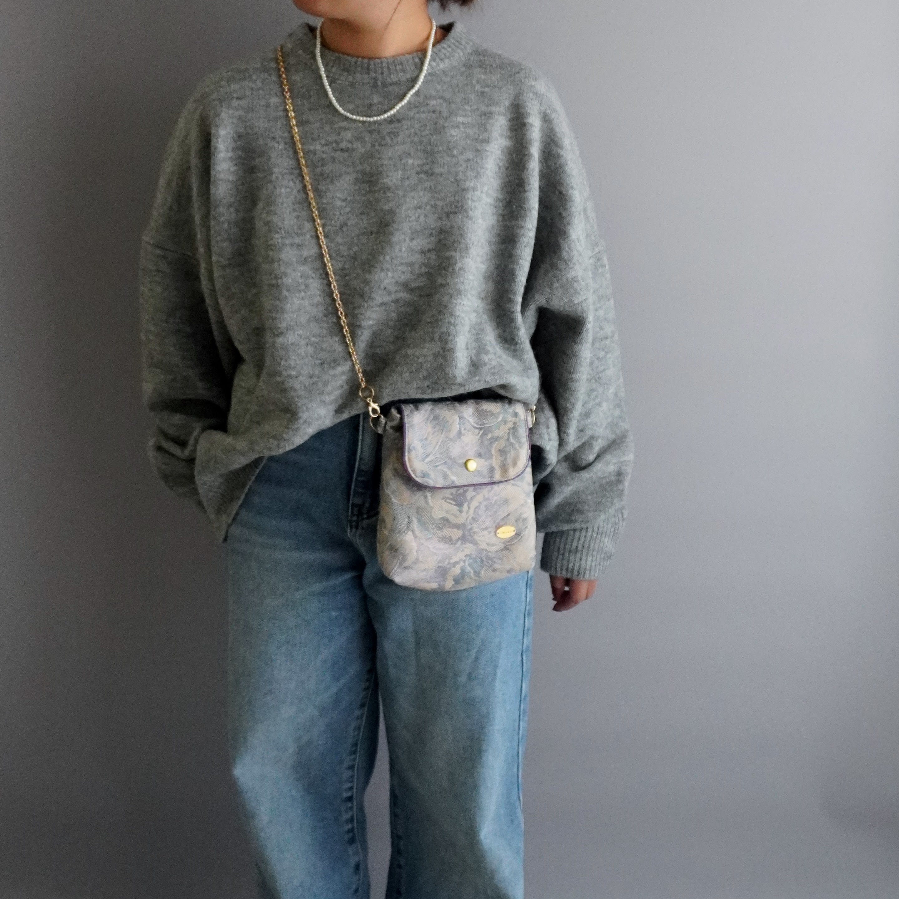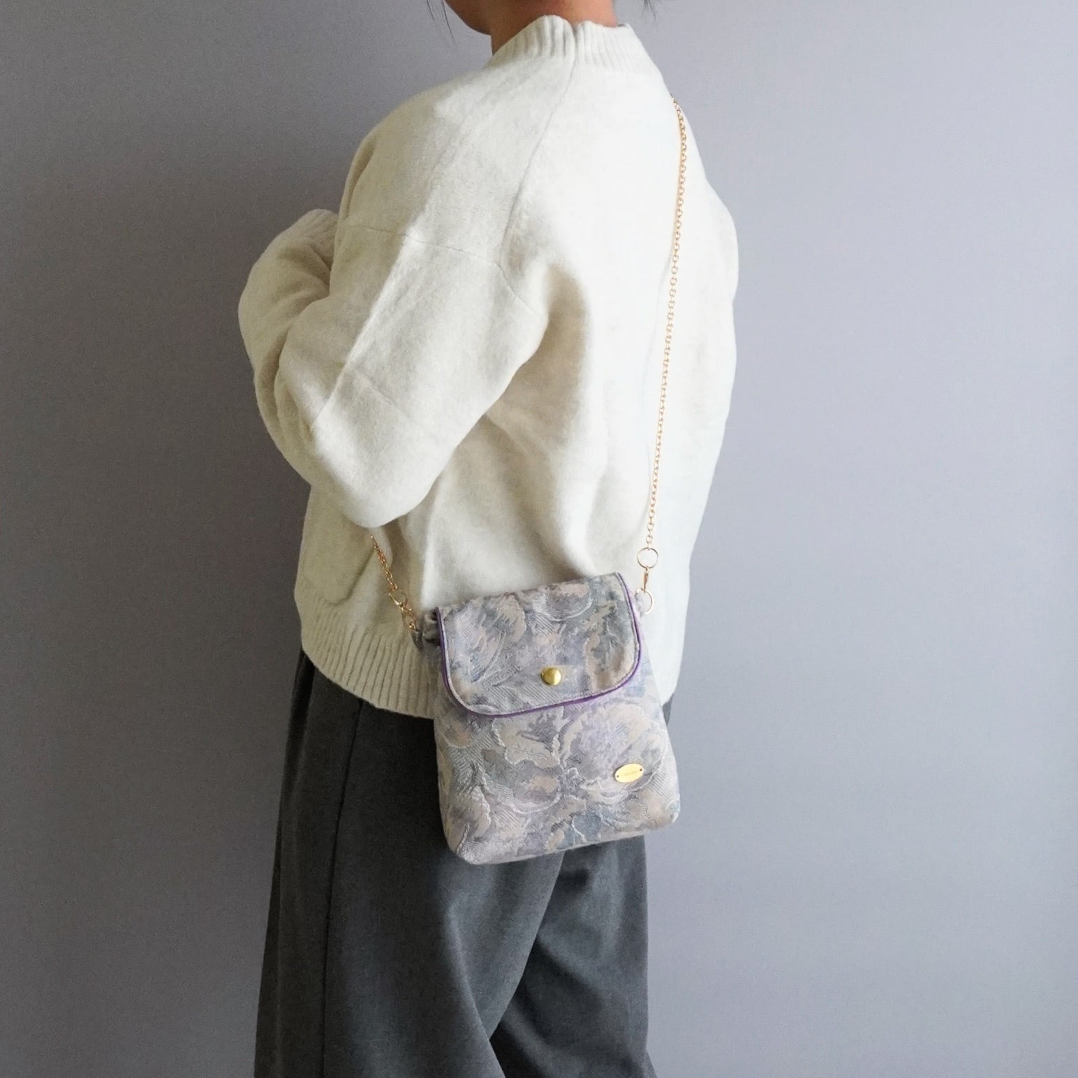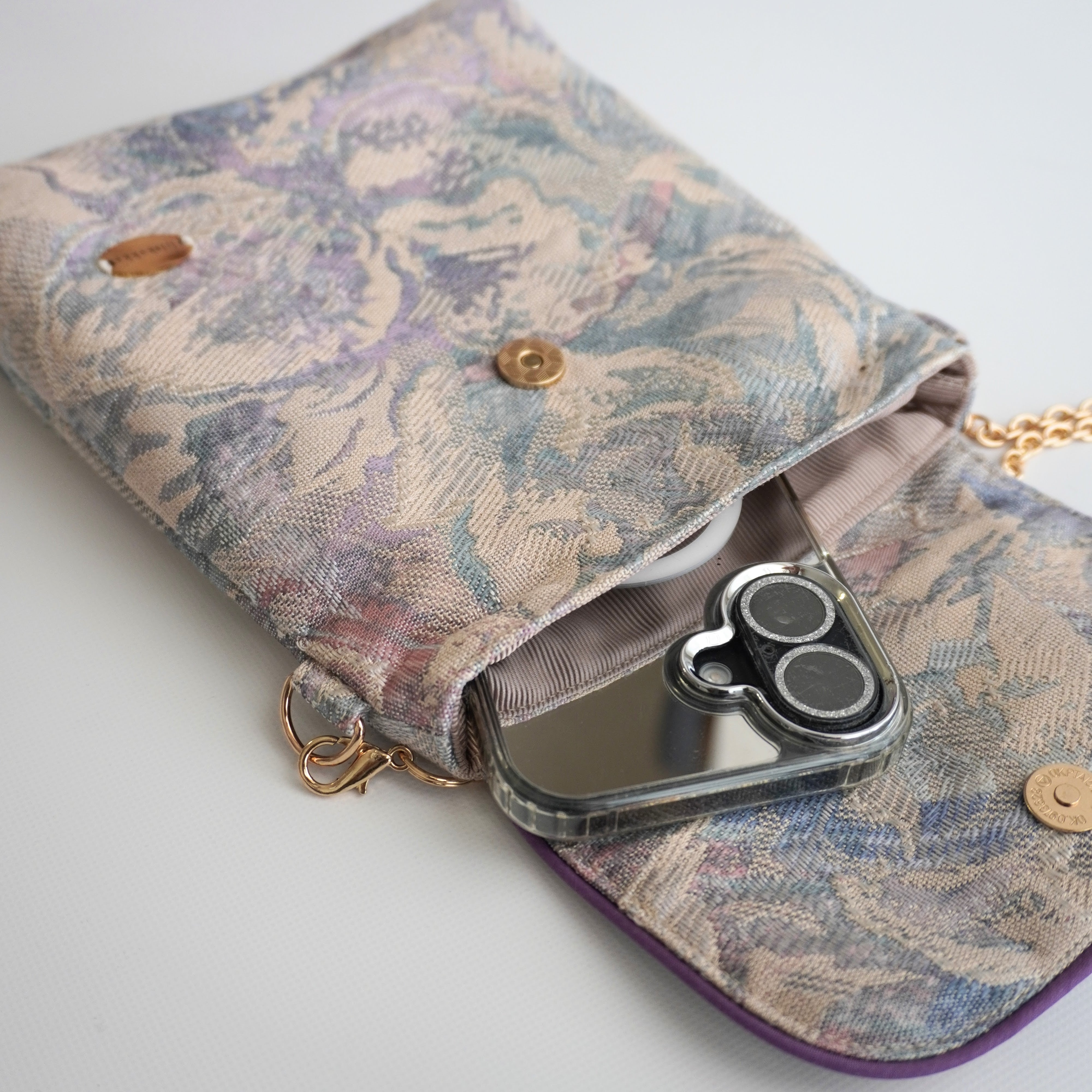 「荷物は最低限で身軽に出かけたい。でも上品さは譲れない」そんな願いを叶えるスマホショルダーです。深みのあるジャガード織りの生地が、装いに上品なアクセントを添えてくれます。