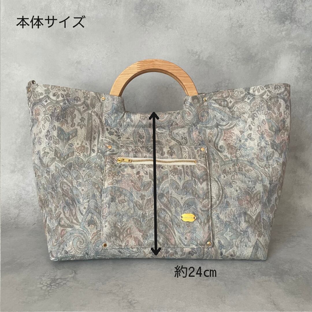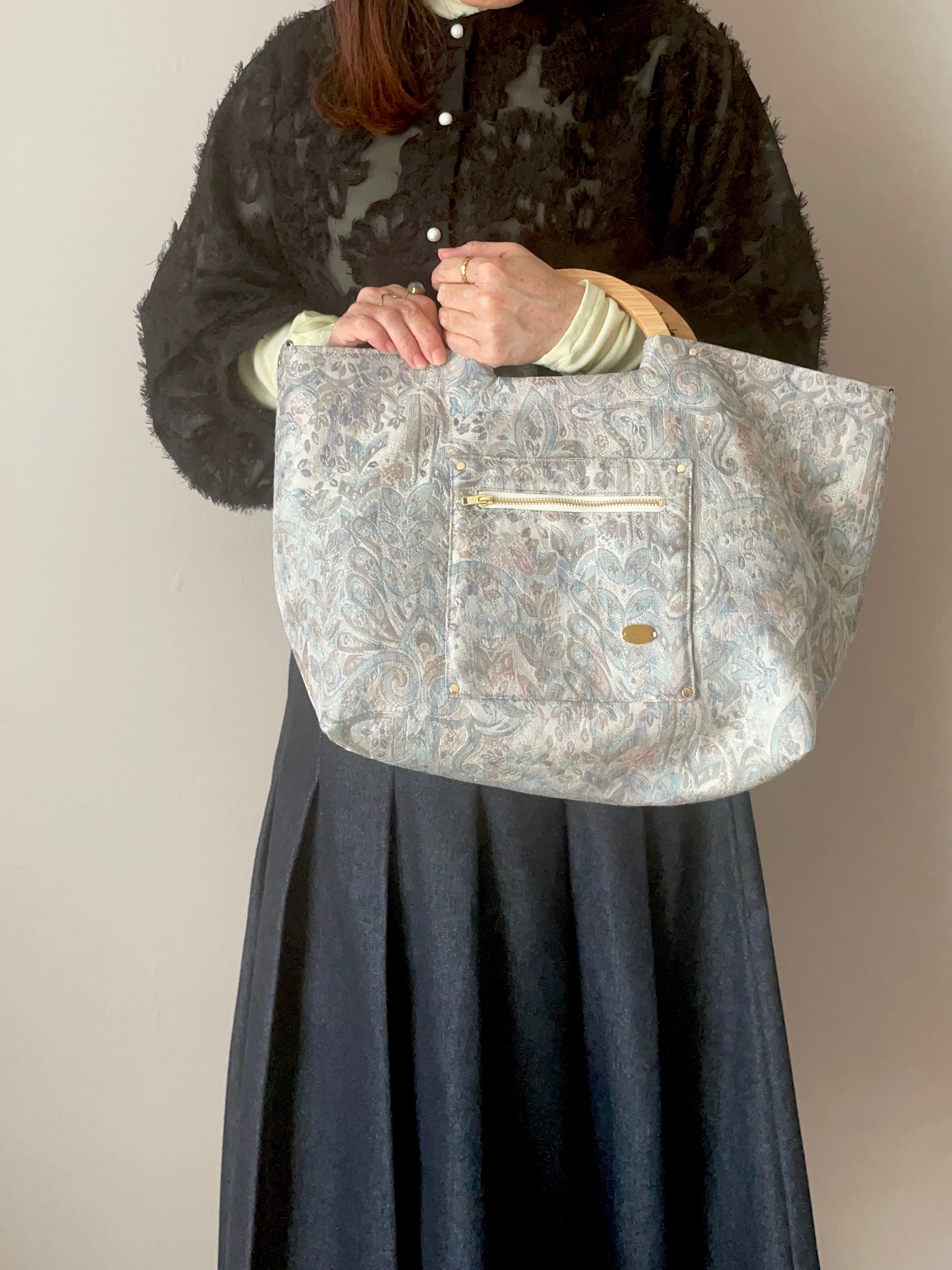 ブルーグレー色をベースとした、華やかで品のあるジャガード生地を主役にした大きめサイズのバッグです。