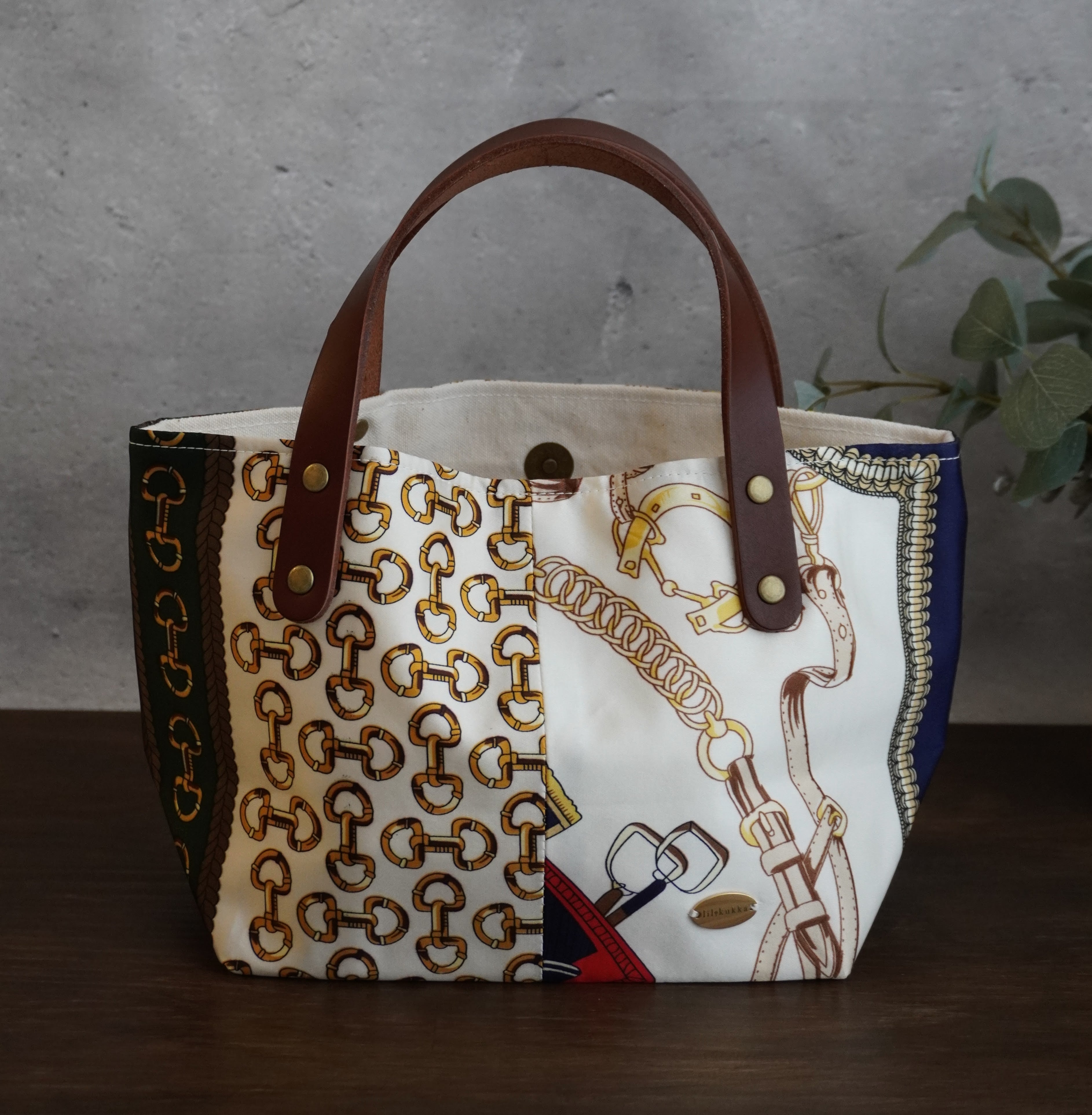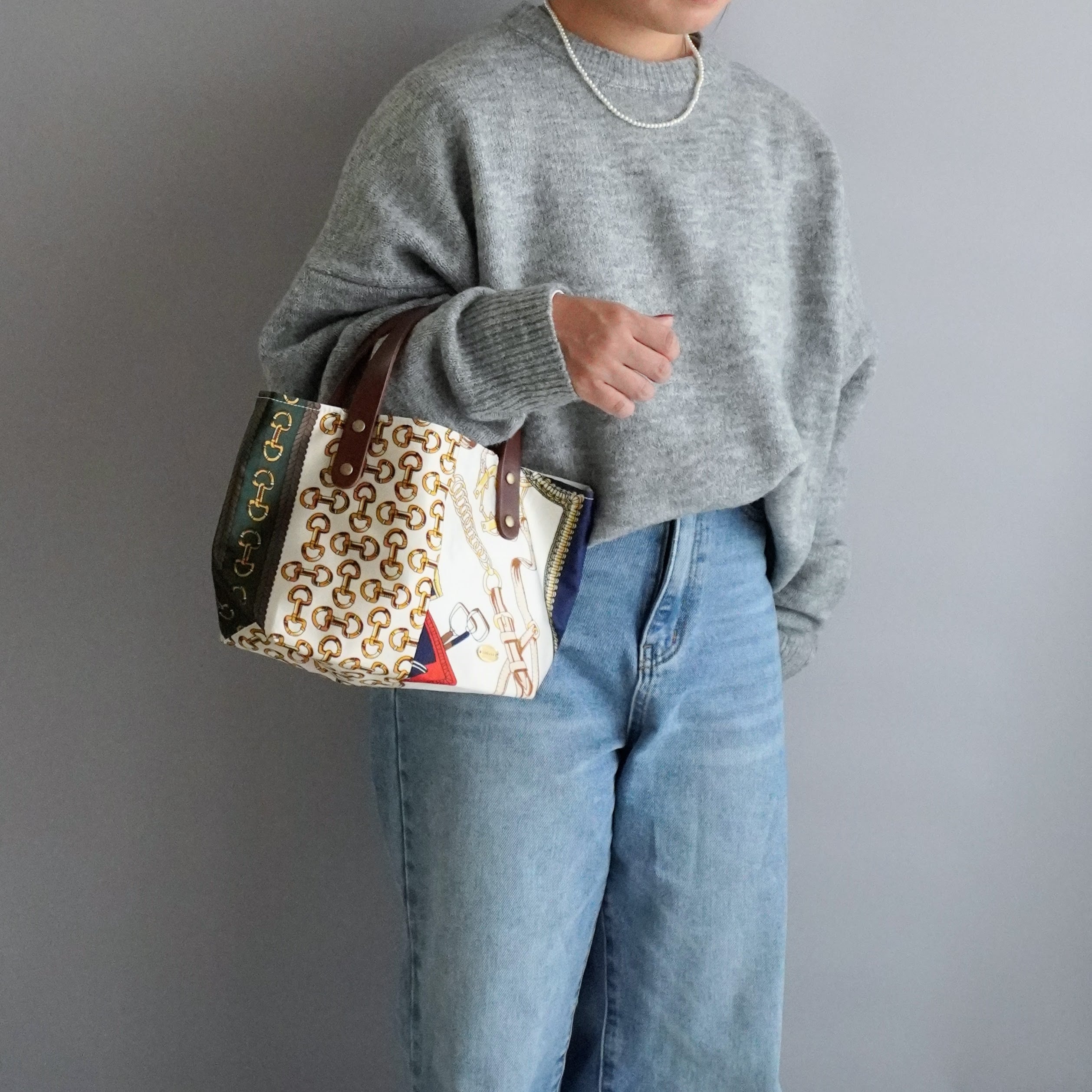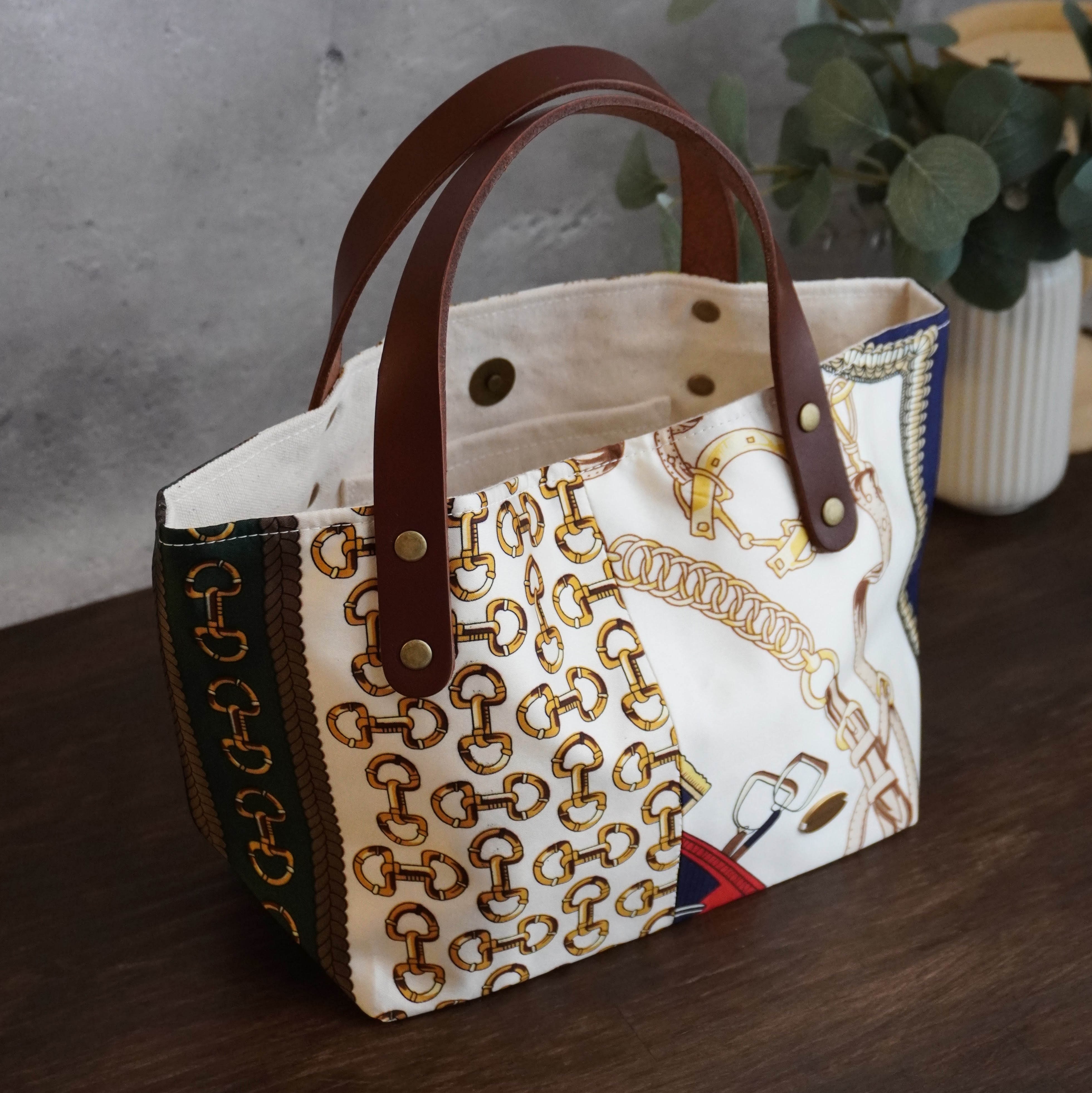 スカーフ 生地 × 帆布 の 舟形 トートバッグ