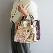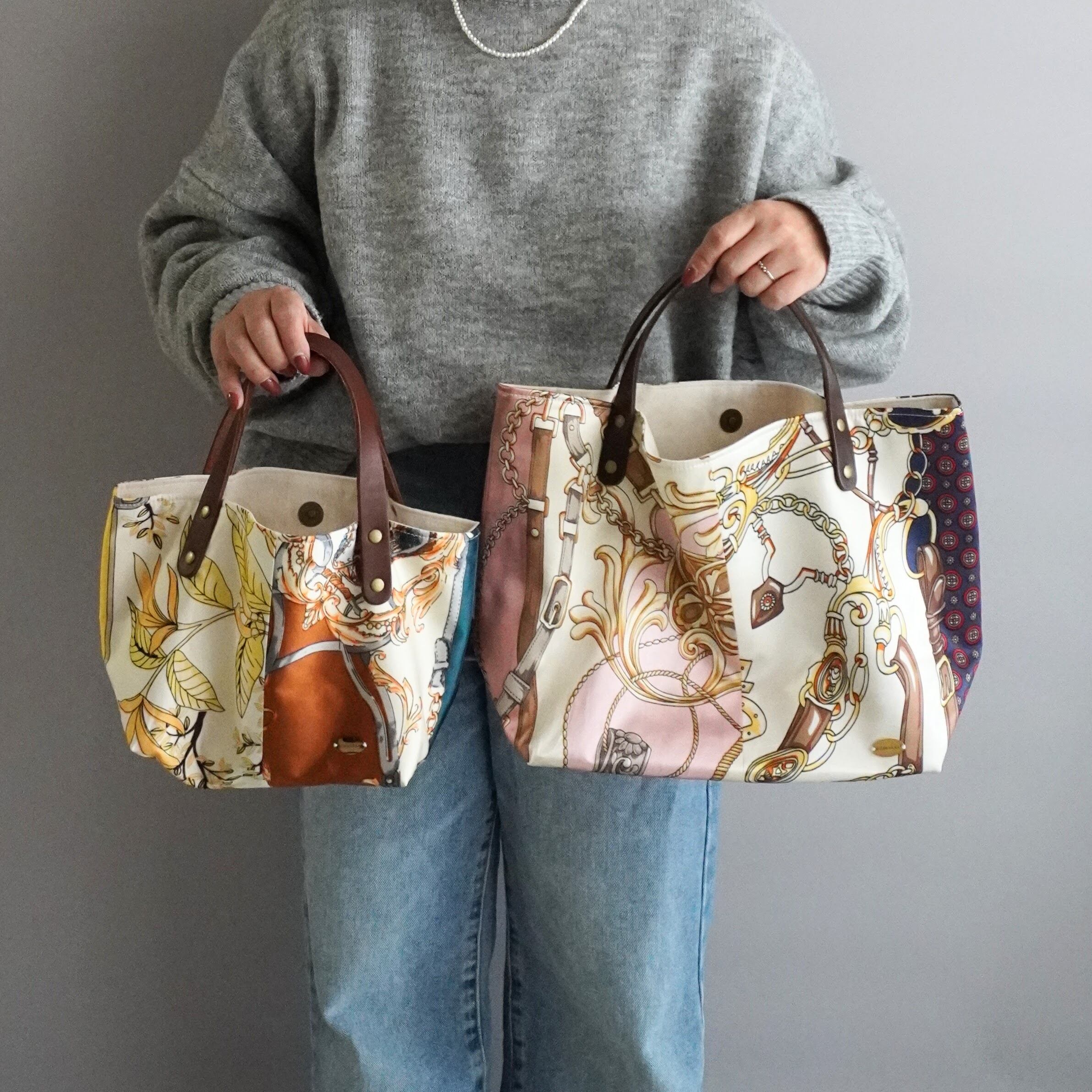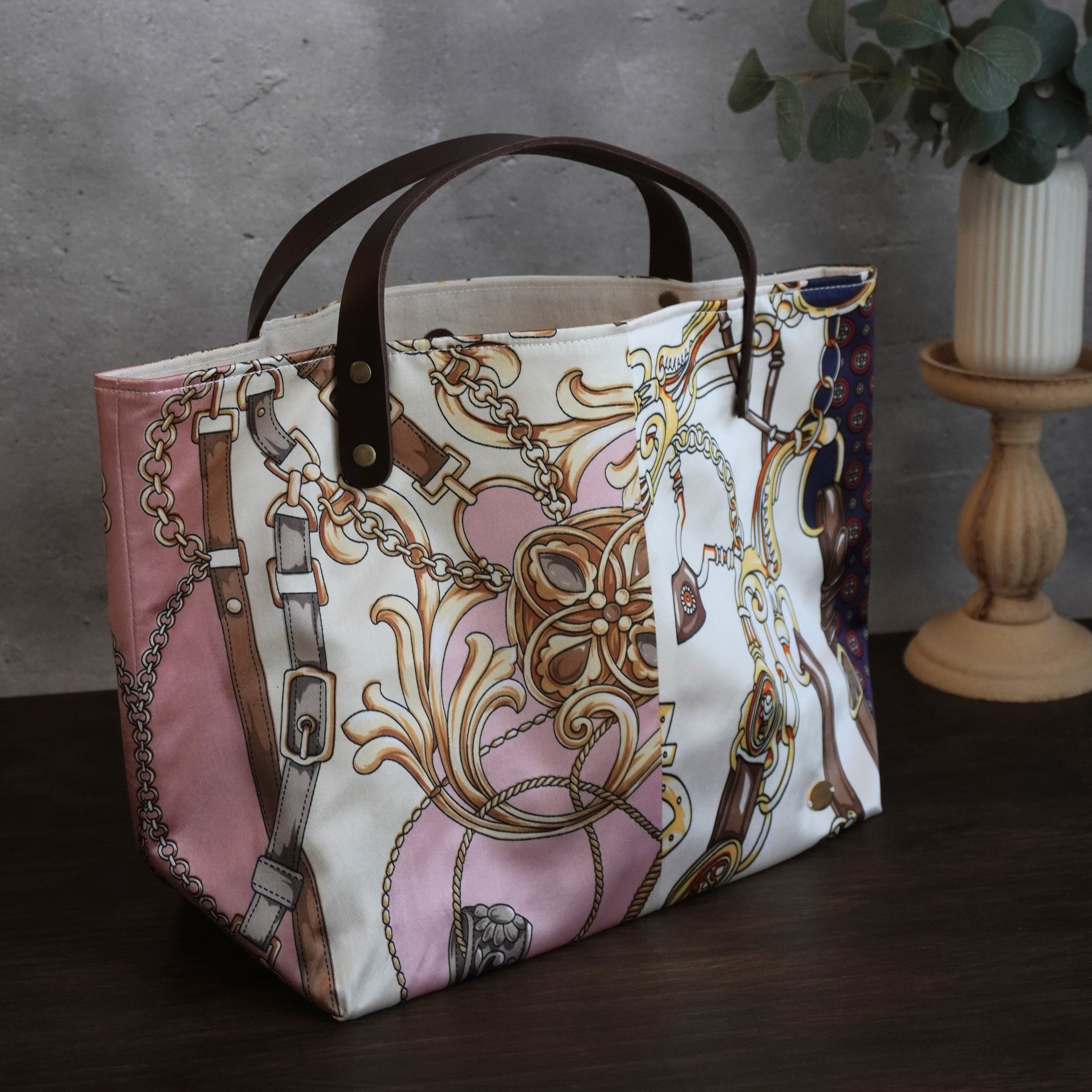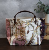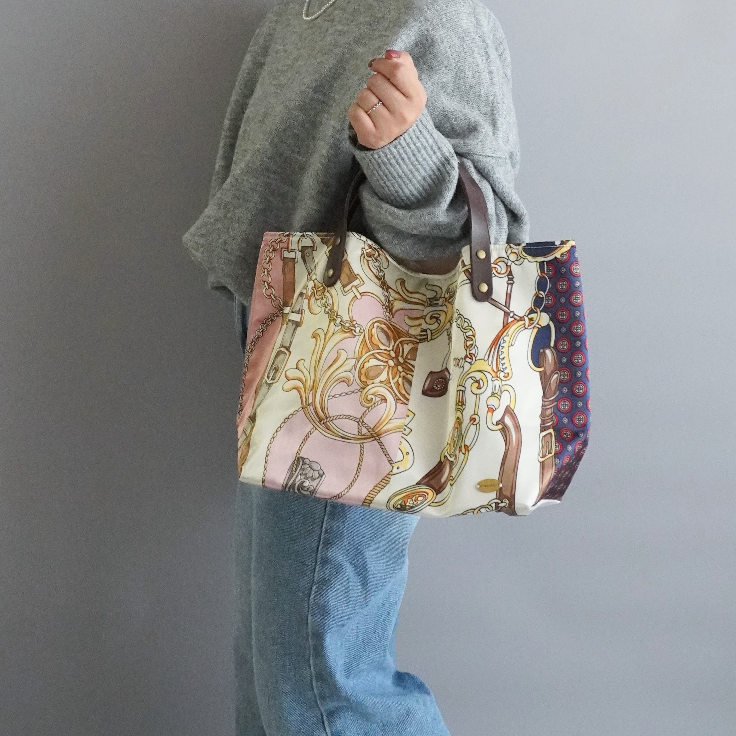 上品 な スカーフ生地 を贅沢に使用し、洗練された 大人 の雰囲気を演出する 舟形トートバッグ 。